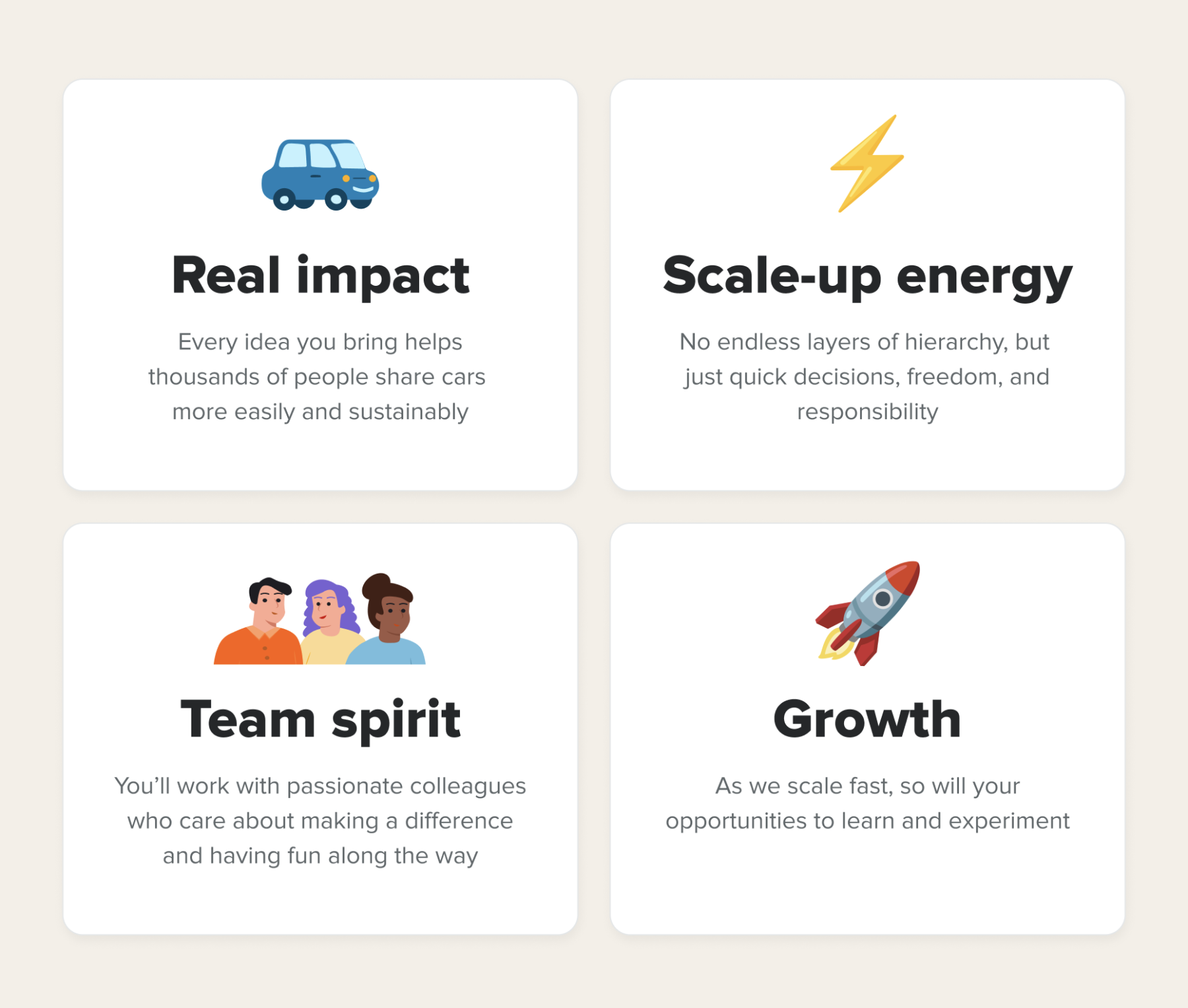 At SnappCar, you’re not just taking a job, you’re joining a movement. We’re here to change the way people think about mobility: fewer parked cars, more shared rides, and a positive impact on our cities and our planet. What makes working here special?
